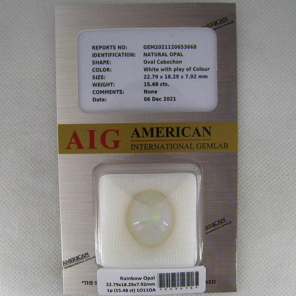 15.48 ct AIG CERTIFIED OVAL CABOCHON (22.79 x 18.29 mm) WELO RAINBOW OPAL
