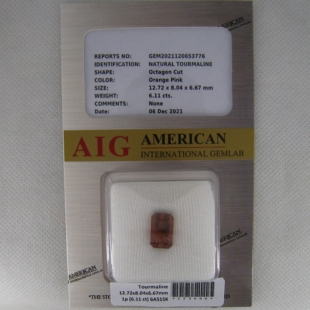 6.11 ct AIG Certified Octagon (12.72 x 8.04 mm) Natural Orange Pink Tourmaline