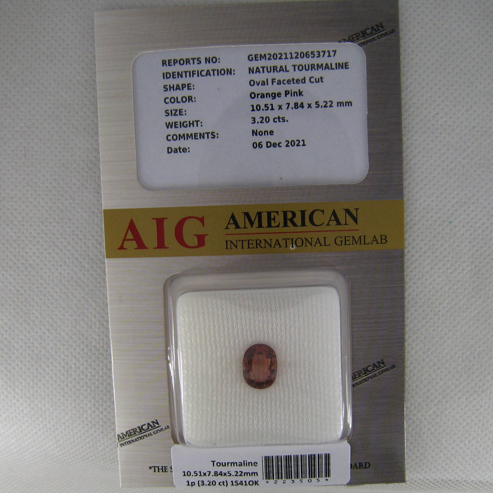 3.20 ct AIG Certified Oval Cut (10.51 x 7.84 mm) Natural Orange Pink Tourmaline