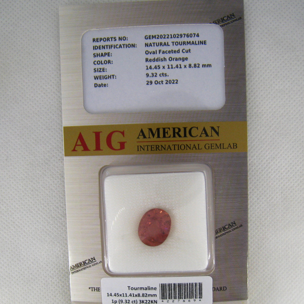 9.32 ct AIG Certified Oval (14.45 x 11.41 mm) Reddish Orange Tourmaline