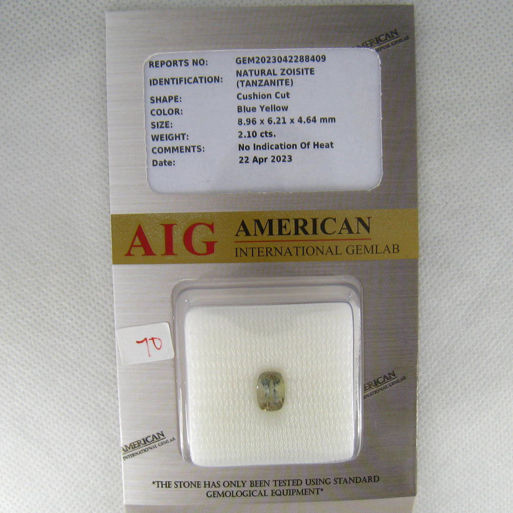 2.10 ct AIG Certified Cushion (8.96 x 6.21 mm) Blue Yellow Tanzanite