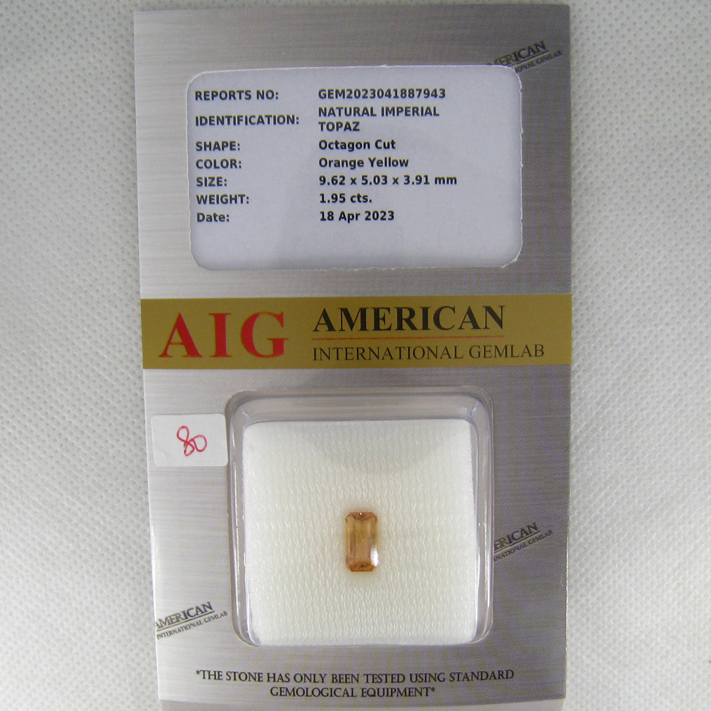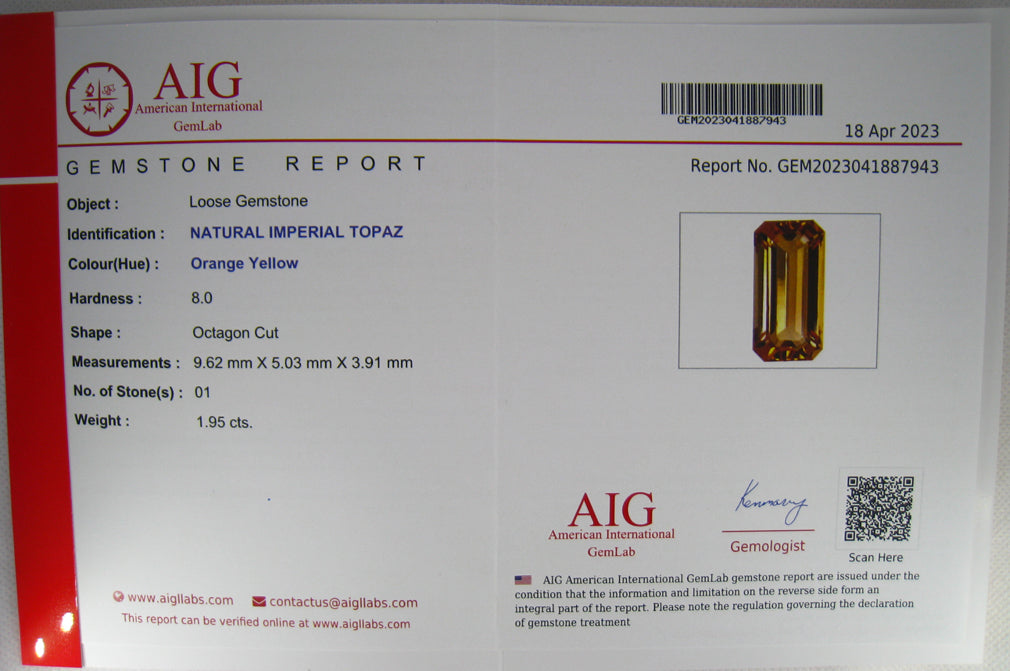 1.95 ct AIG Certified Octagon(9.62 x 5.03 mm)Orange Yellow Imperial Topaz