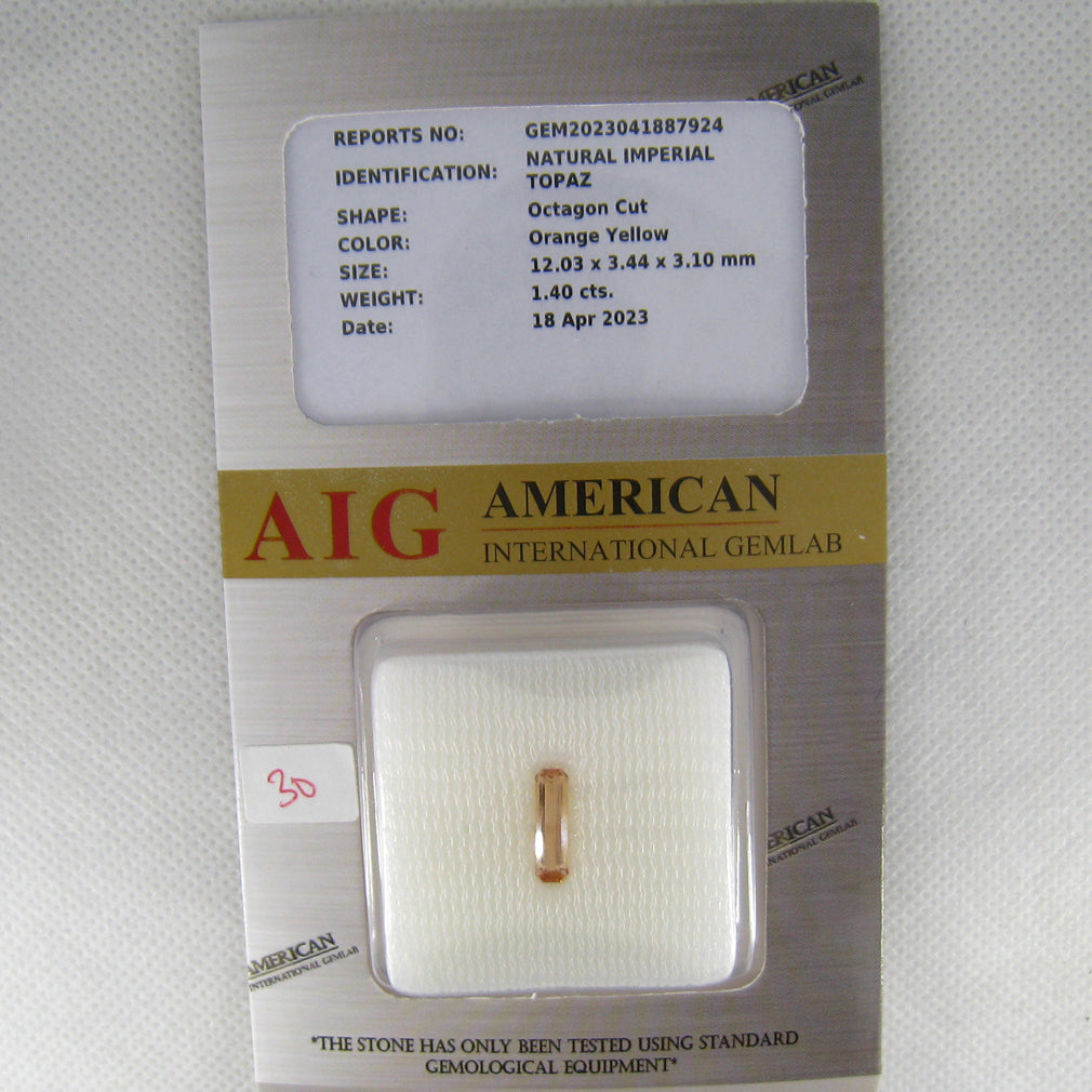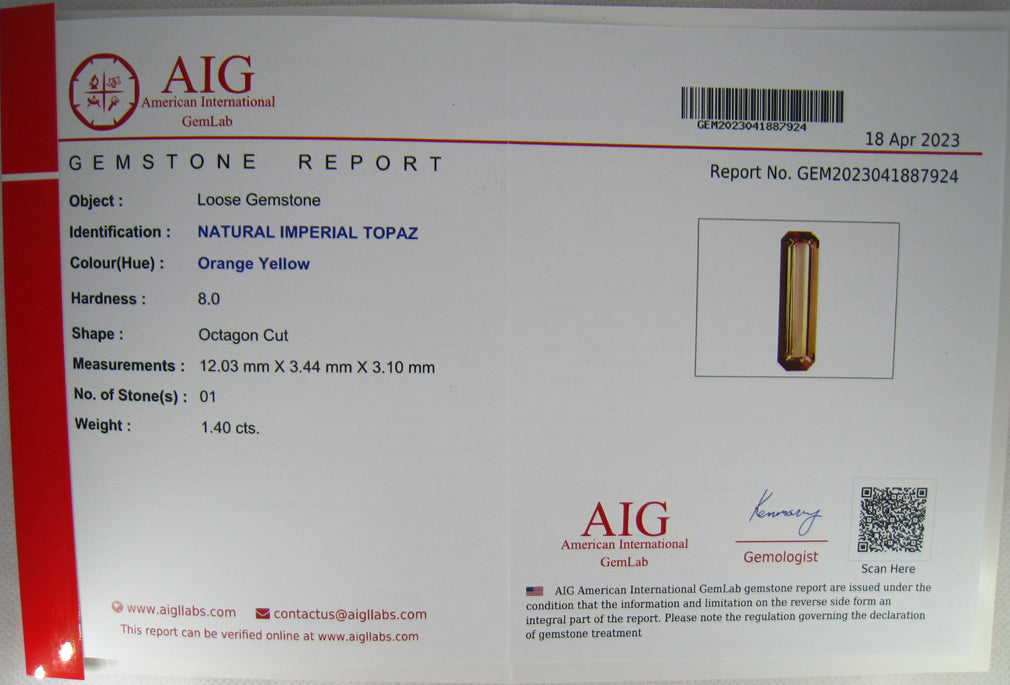 1.40 ct AIG Certified Octagon(12.03 x 3.44 mm)Orange Yellow Imperial Topaz