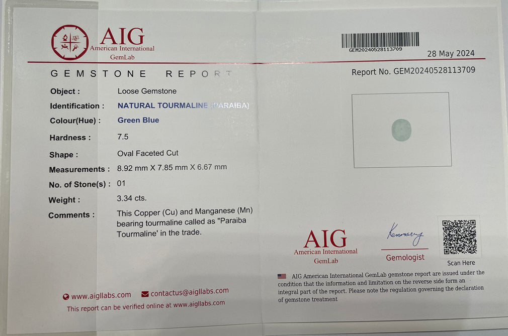 3.34 ct AIG CERTIFIED OVAL (8.92 x 7.85 mm) COPPER BEARING PARAIBA TOURMALINE