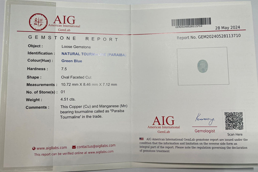 4.51 ct AIG CERTIFIED OVAL (10.72 x 8.46 mm) COPPER BEARING PARAIBA TOURMALINE