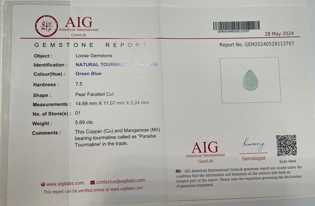 5.69 ct AIG CERTIFIED PEAR (14.69 x 11.07 mm) COPPER BEARING PARAIBA TOURMALINE