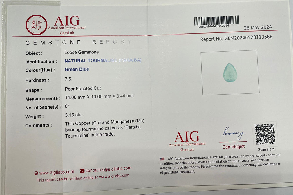 3.16 ct AIG CERTIFIED PEAR (14.00 x 10.06 mm) COPPER BEARING PARAIBA TOURMALINE