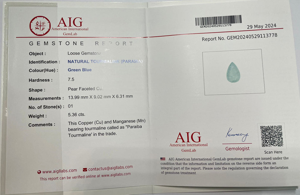 5.36 ct AIG CERTIFIED PEAR (13.99 x 9.02 mm) COPPER BEARING PARAIBA TOURMALINE