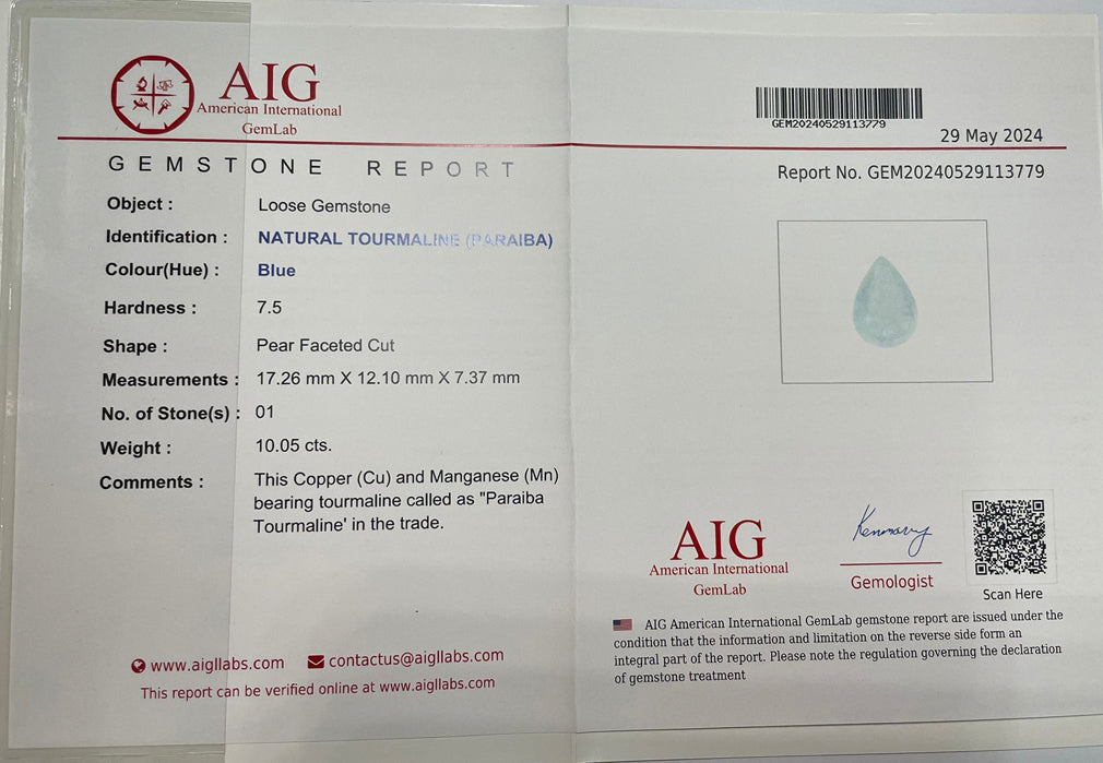 10.05 ct AIG CERTIFIED PEAR (17.26 x 12.10 mm) COPPER BEARING PARAIBA TOURMALINE