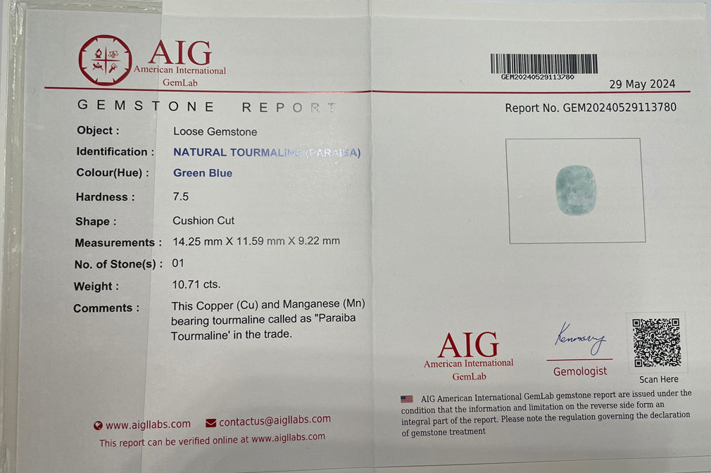 10.71 ct AIG CERTIFIED (14.25 x 11.59 mm) COPPER BEARING PARAIBA TOURMALINE