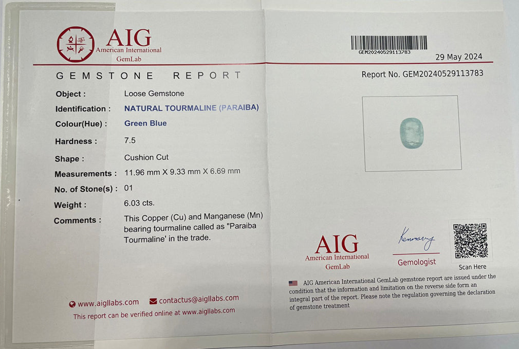 6.03ct AIG CERTIFIED CUSHION (11.96 x 9.33 mm) COPPER BEARING PARAIBA TOURMALINE