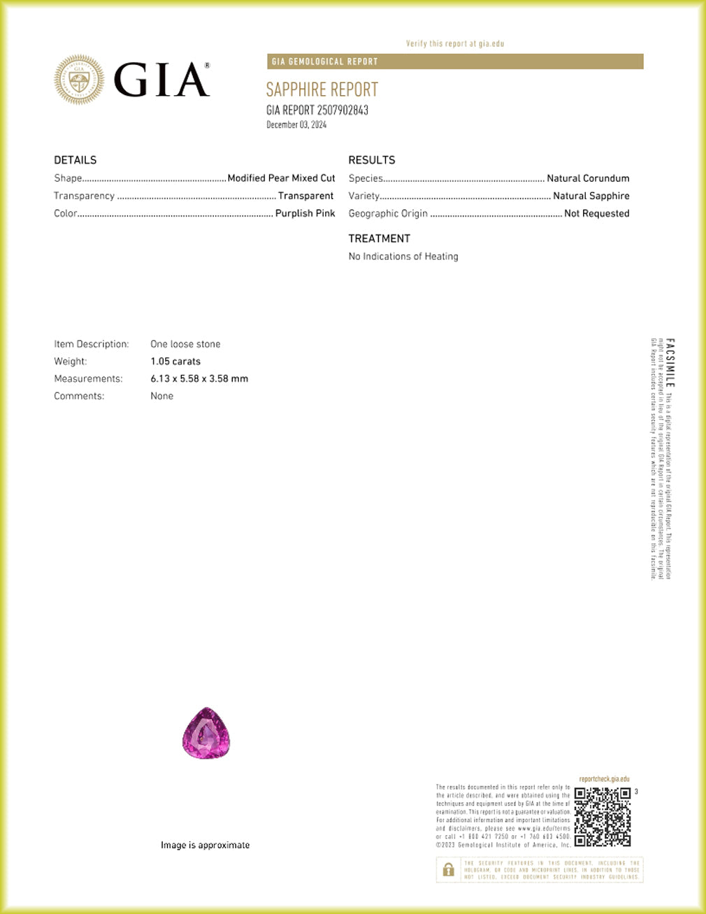 GIA Certified 1.05 ct Pear (6.13 x 5.58 mm) Unheated Purplish Pink Sapphire