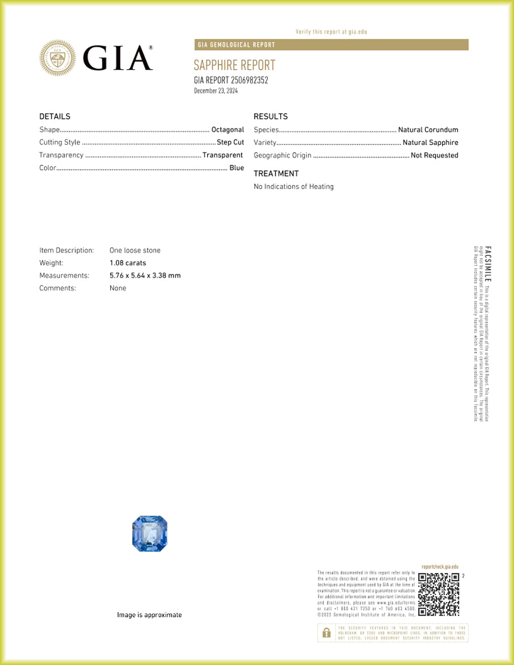 GIA Certified 1.08 ct Significant Octagon(5.76 x 5.64 mm)Unheated Blue Sapphire