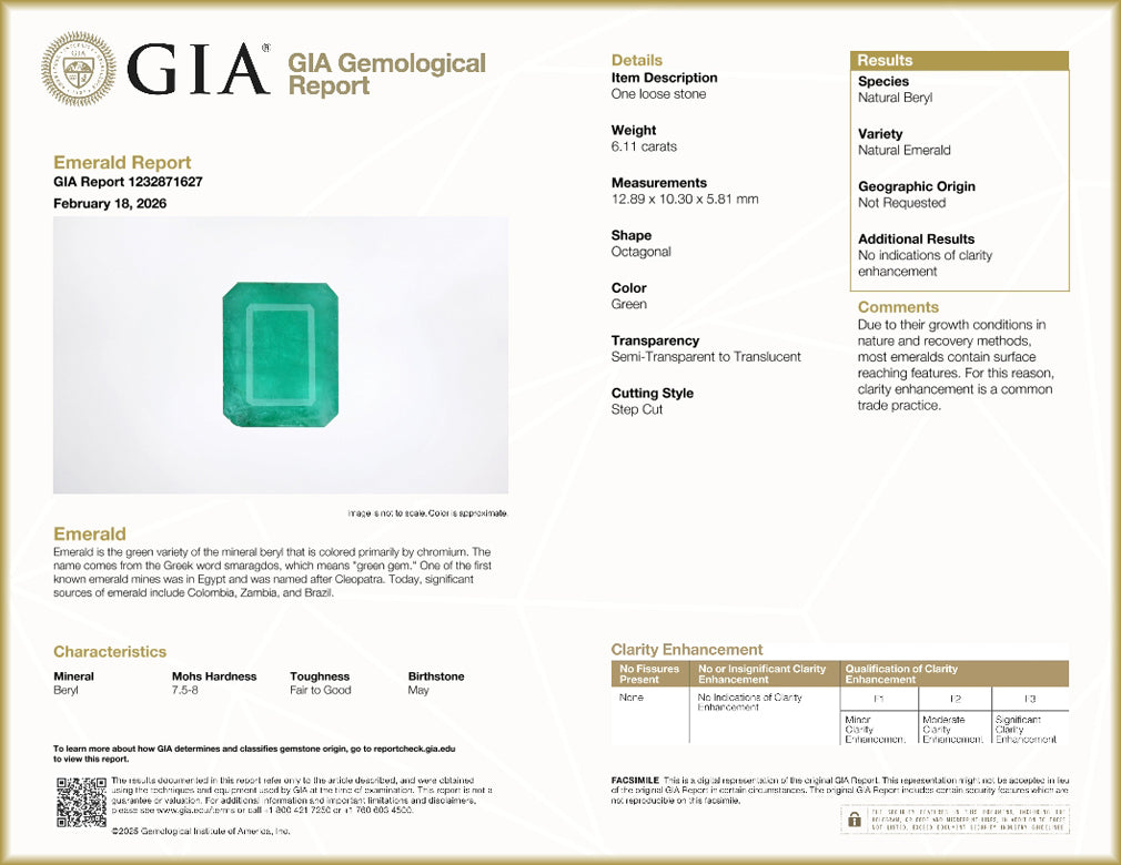 GIA Certified 6.11 ct Octagon (12.89 x 10.30 mm) Unheated Natural Green Emerald